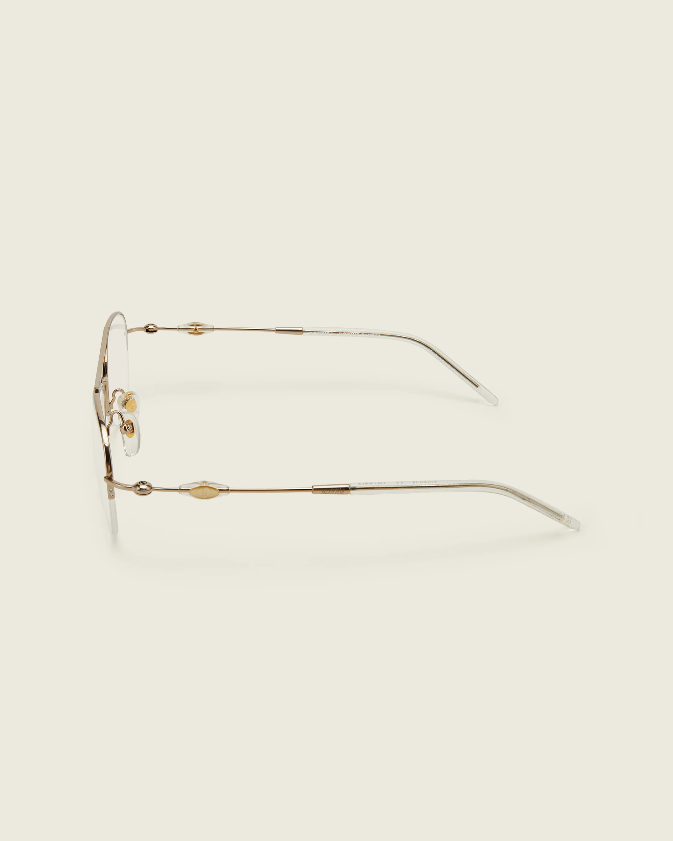 Gold titanium half-rim aviator frames with transparent yellow acetate details. Features adjustable nose pads and exploding heart acetate bead on arm temples.