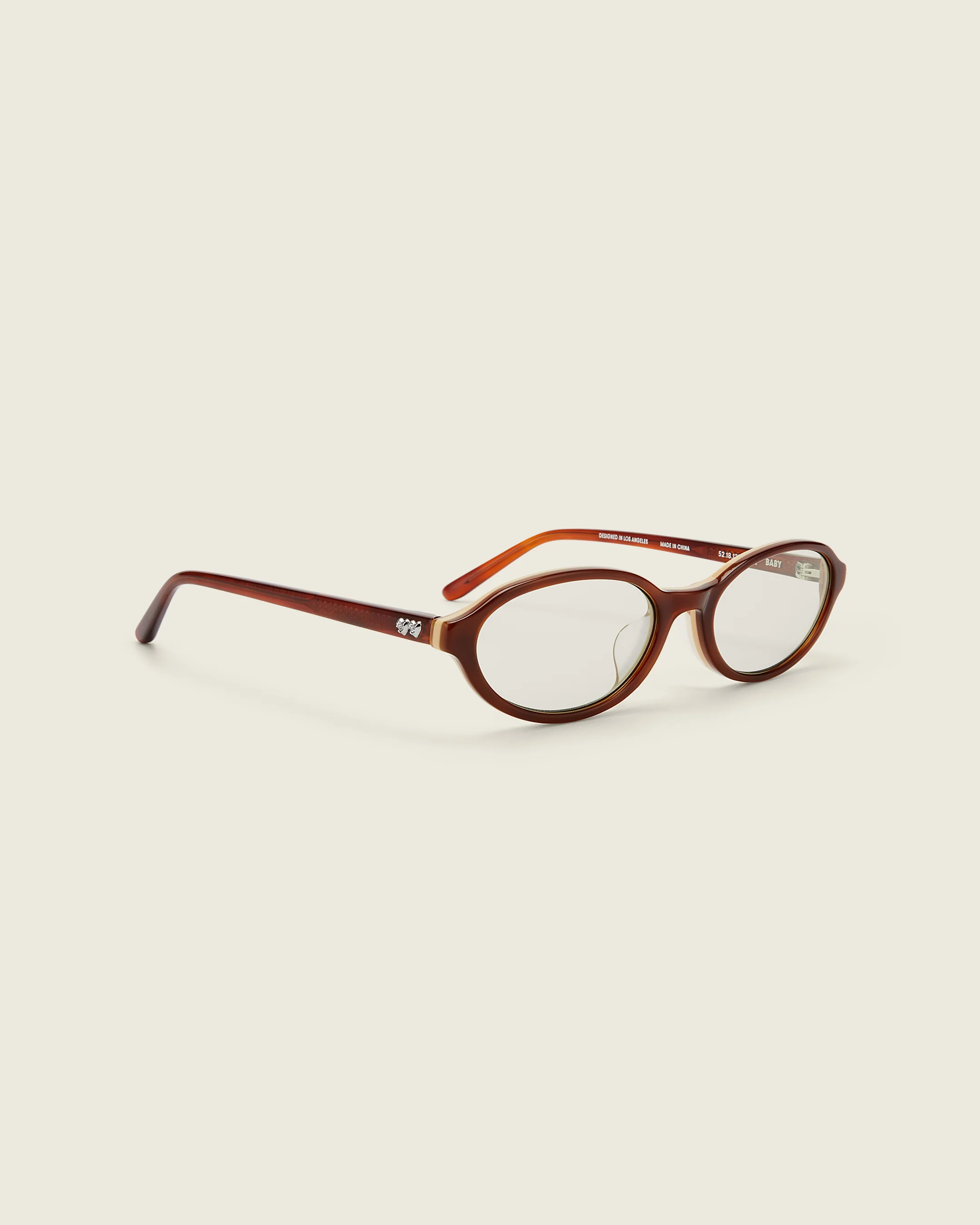 Oval shaped, slim silhouette acetate frames paired with thin straight temples and double heart detailing. Features extended nose pads.