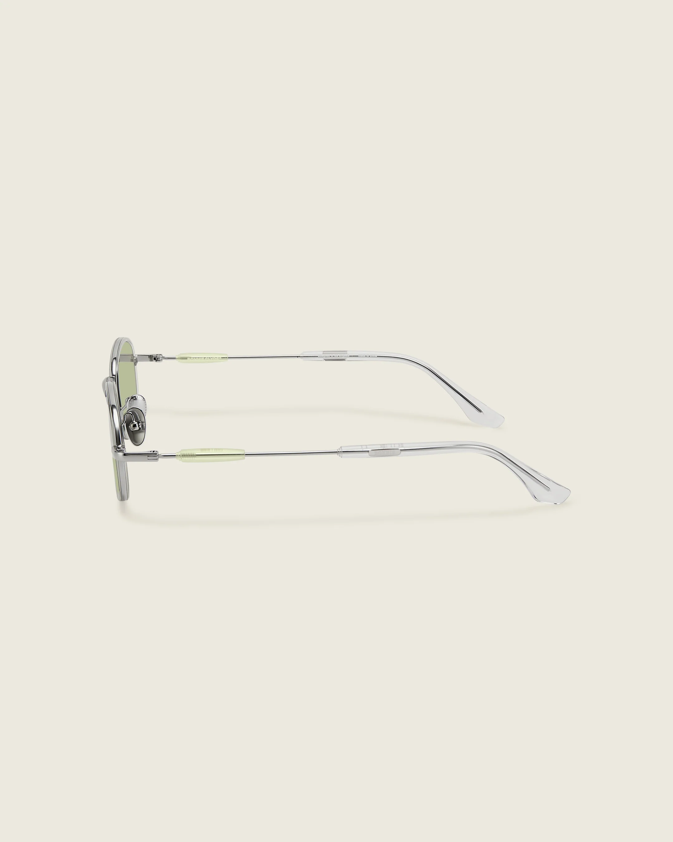 A sleek, round metal frame. Arm temples are made with a combination of durable, lightweight acetate and stainless steel. Features adjustable titanium nose pads, thick ear tips, and acetate-encased lenses.