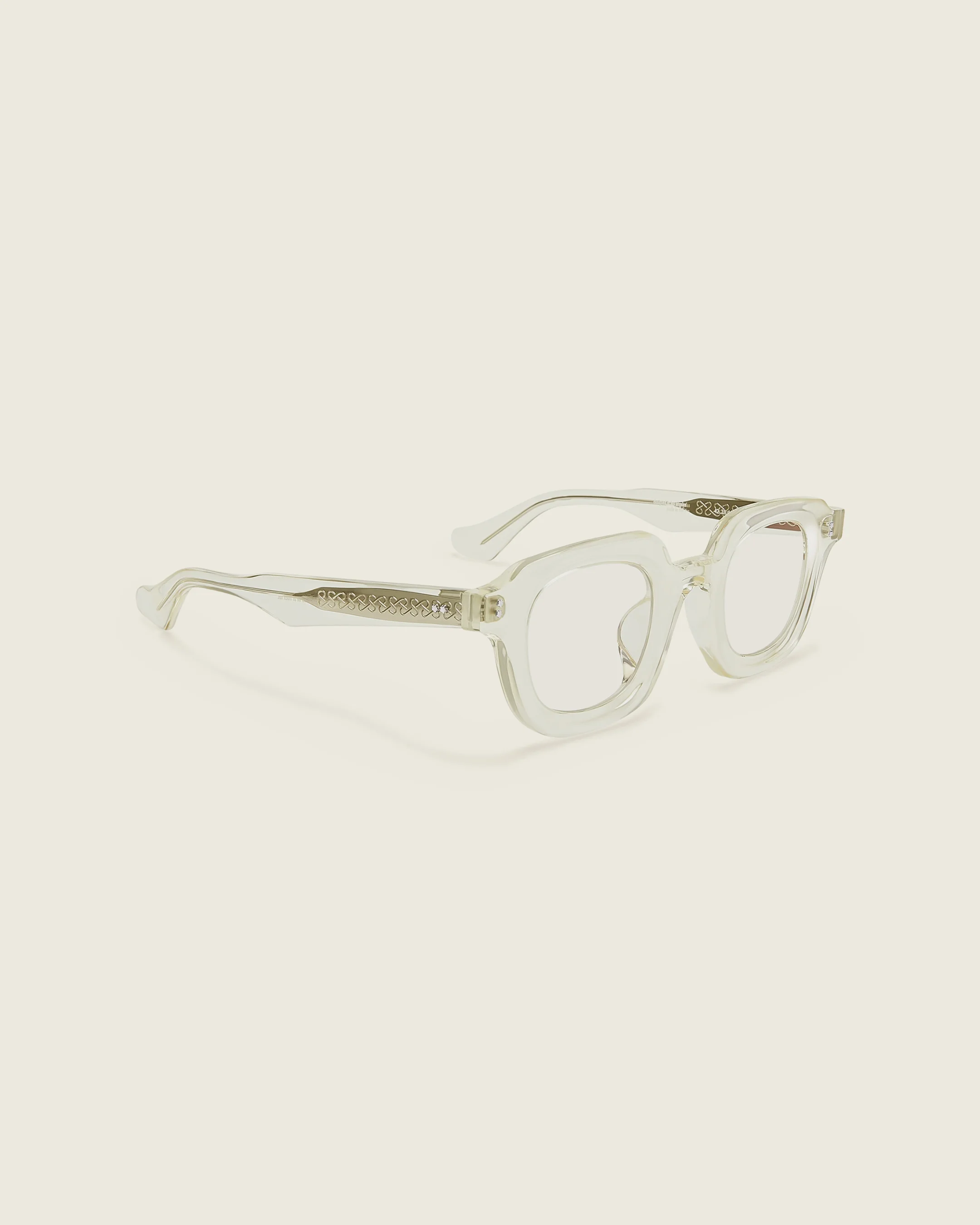 Rounded frames with an angular brow and curved nose bridge. Arm temples feature injected stainless steel core wire and flower metal detailing.