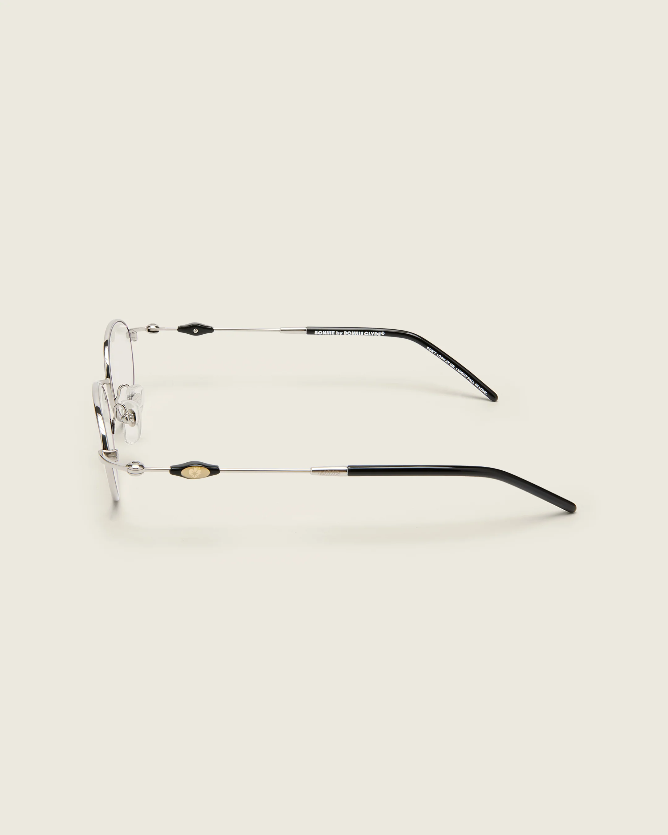 Slim, oval titanium frames with adjustable nose pads and lightweight acetate arm temple. Features custom exploding heart bead along the temple and a minimalist wire-core silhouette.
