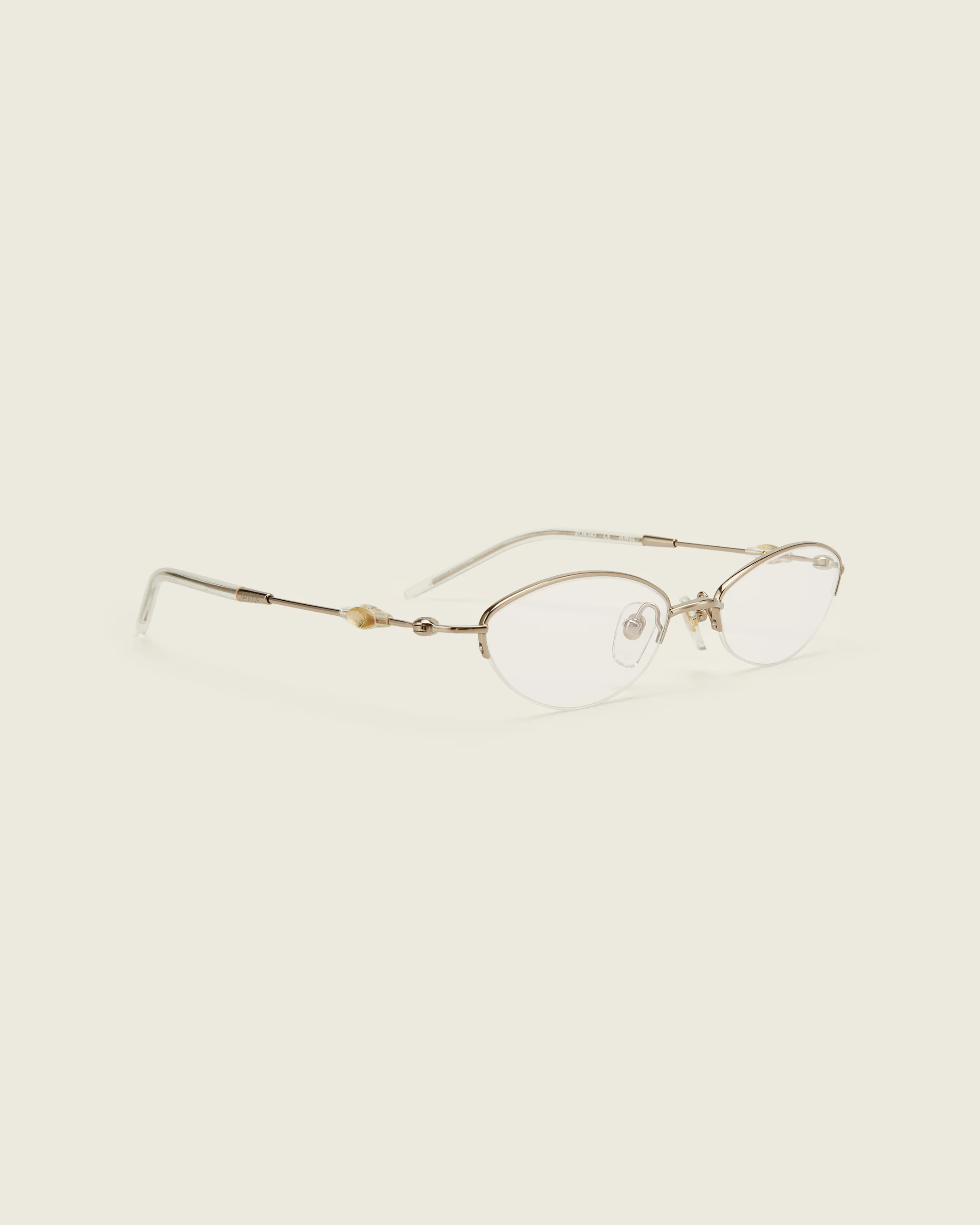 Gold titanium half rim oval frames with transparent yellow acetate details. Features adjustable nose pads and exploding heart acetate bead on arm temples.
