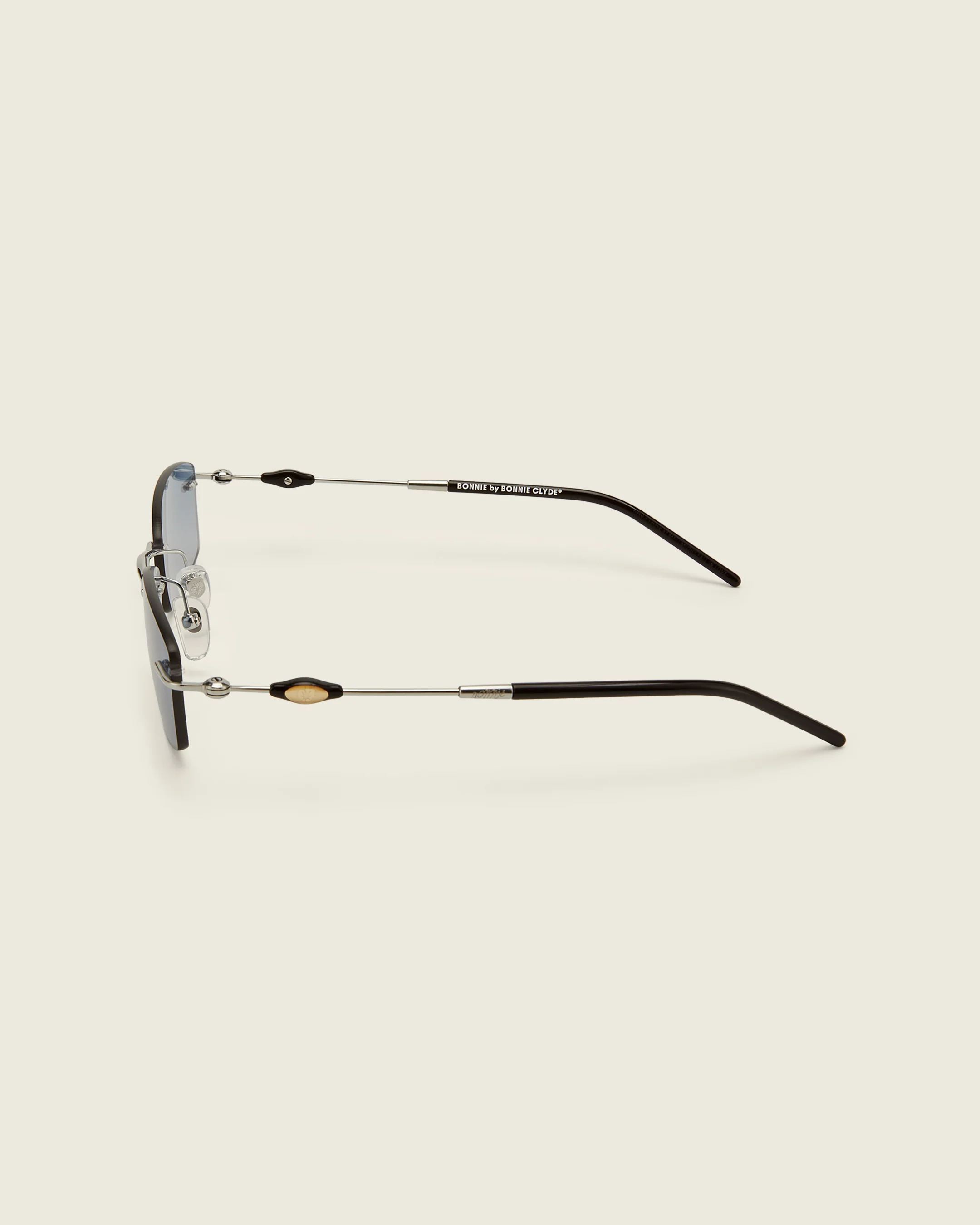 Silver titanium rectangular rim-less frames with dark brown acetate details. Features adjustable nose pads and exploding heart acetate bead on arm temples.