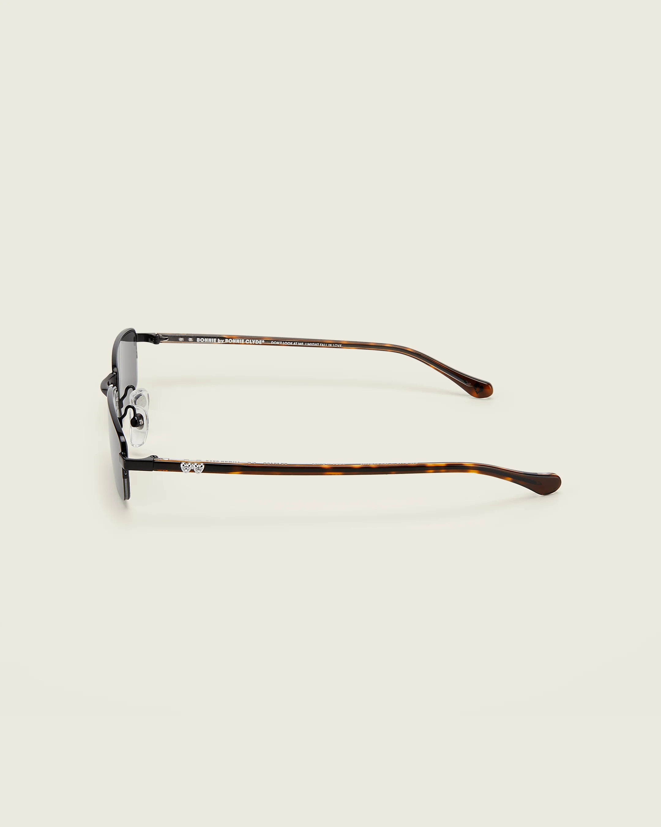 Half rim, stainless steel, rectangular frames paired with acetate arm temples and rhinestone double hearts. Features adjustable, extended nose pads.
