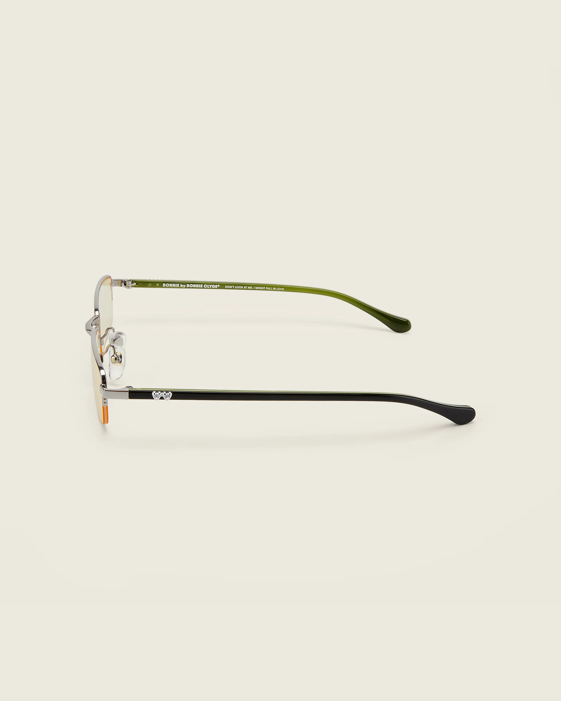 Half rim, stainless steel, rectangular frames paired with acetate arm temples and rhinestone double hearts. Features adjustable, extended nose pads.