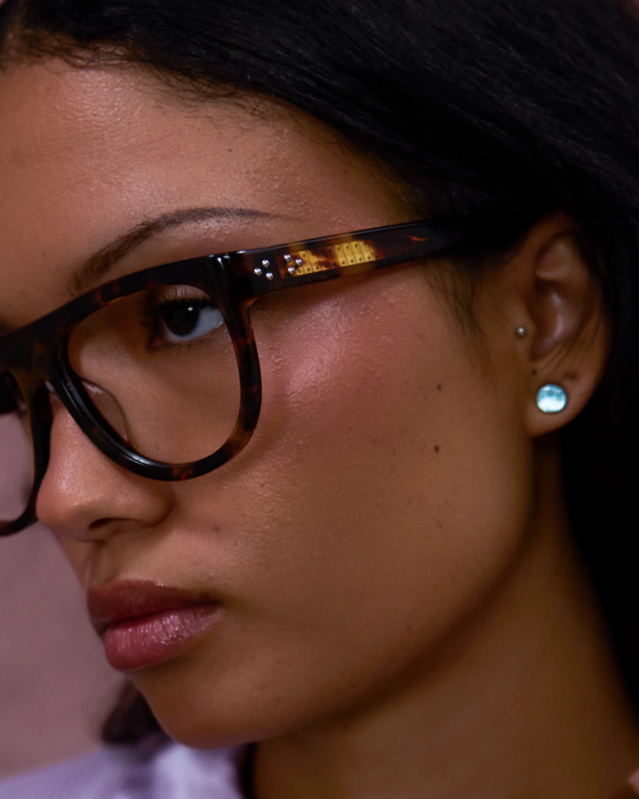 Oversized aviator-style acetate frames with a bold browline and deep lenses. Features mirrored triple metal bead detailing at the hinge and arm temple.