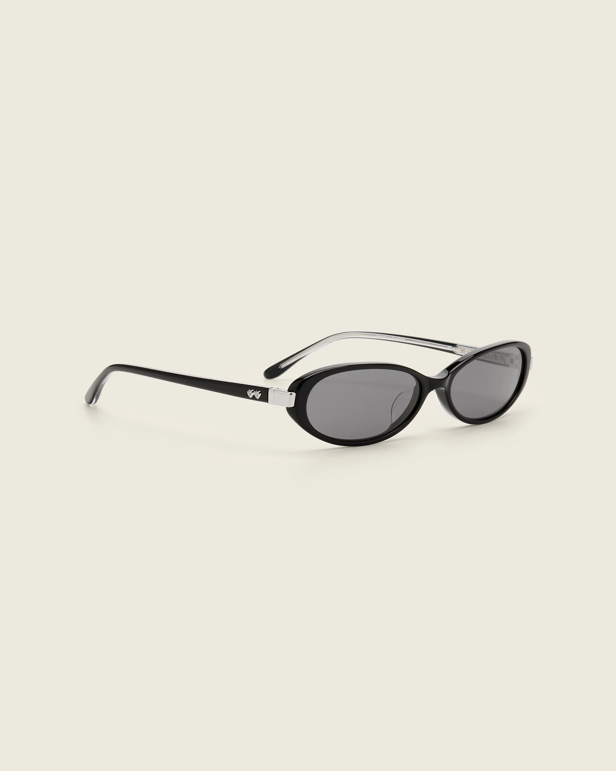 Petite oval frames with a slim, sculpted profile. Designed with lightweight acetate materials, metal hinge accents, and double rhinestone heart at the temple.