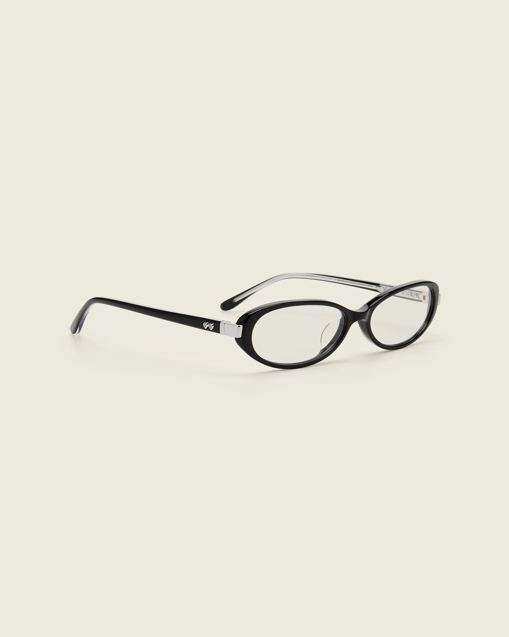 Petite oval frames with a slim, sculpted profile. Designed with lightweight acetate materials, metal hinge accents, and double rhinestone heart at the temple.
