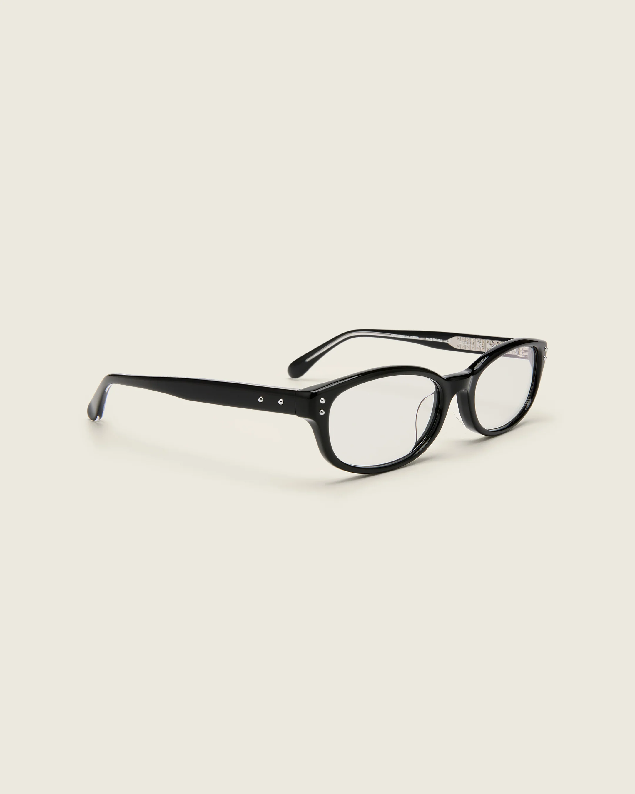 Narrow oval acetate frames with a curved nosebridge and extended ear tips. Features matching double metal bead detailing on ear tips and arm temples.