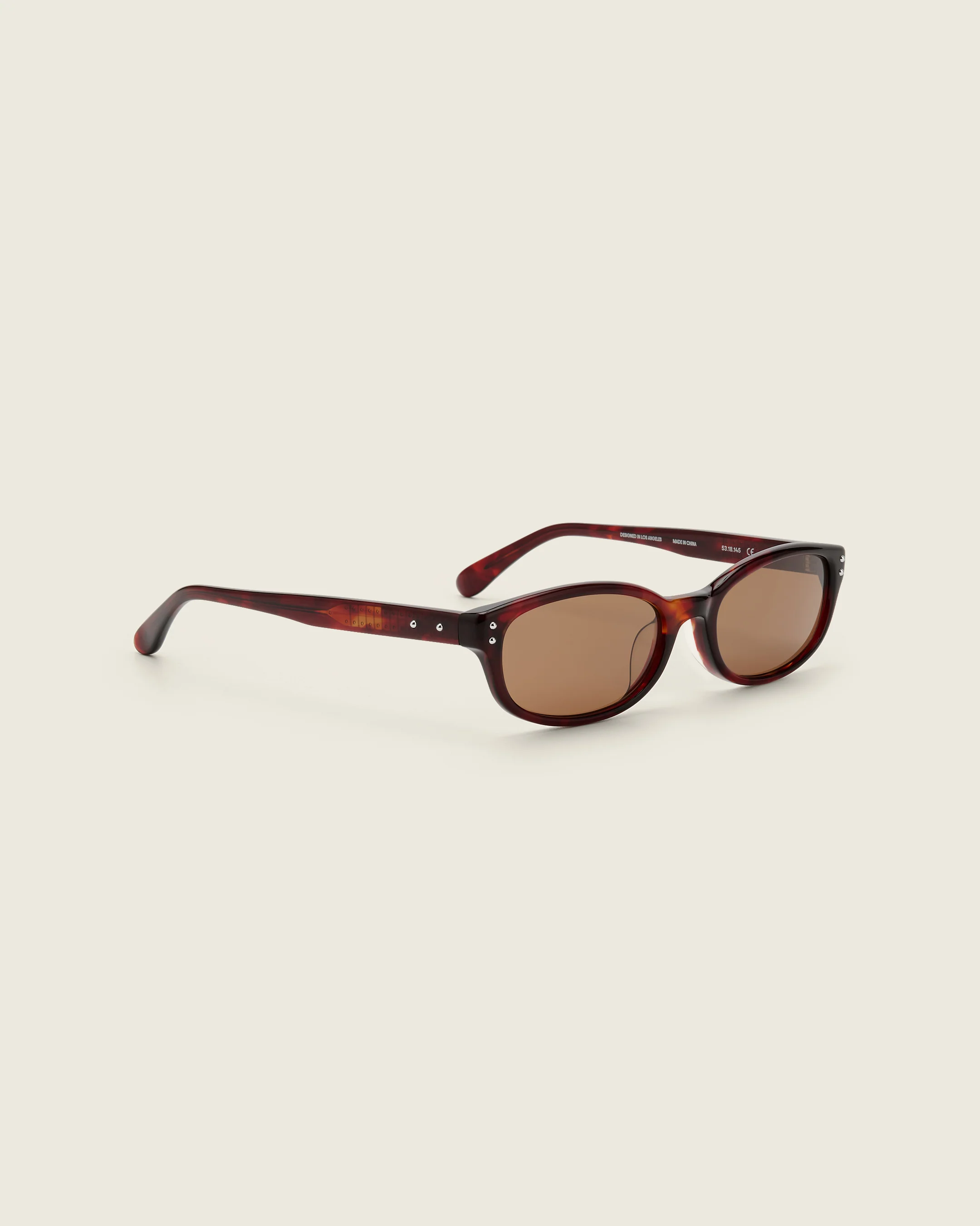Narrow oval acetate frames with a curved nosebridge and extended ear tips. Features matching double metal bead detailing on ear tips and arm temples.