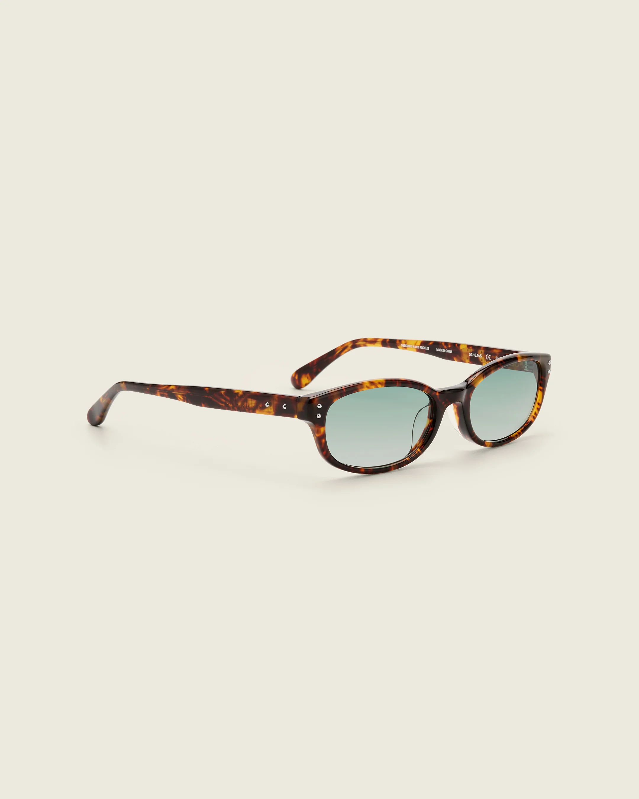Narrow oval acetate frames with a curved nosebridge and extended ear tips. Features matching double metal bead detailing on ear tips and arm temples.